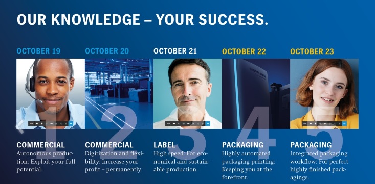 Alles in het vijfdaagse online evenement is gericht op het delen van kennis over de prangende vraagstukken in de branche. Hoe kunnen commerciële drukkerijen de complexiteit verminderen en tegelijkertijd de efficiëntie en productiviteit verhogen? Deze en andere onderwerpen komen aan bod in de eerste twee dagen in het commerciële segment. Op de derde dag leren de deelnemers bijvoorbeeld hoe ze hoogwaardige labels economisch en kwalitatief kunnen produceren. De laatste twee dagen staan in het teken staan van Verpakkingen waar Heidelberg zich richt op producties op vouwkarton.